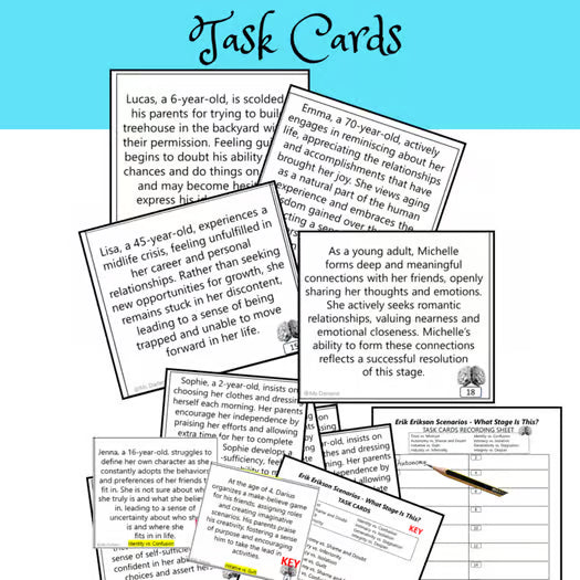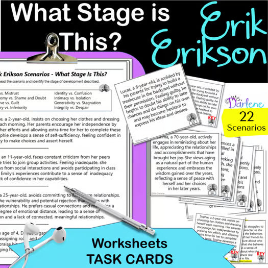 Are you looking for a fresh way to study Erikson's 8 Stages of Development? Here are 2 Scenarios in both worksheet and Task Card form where you read the scenario and identify the appropriate stage of development.