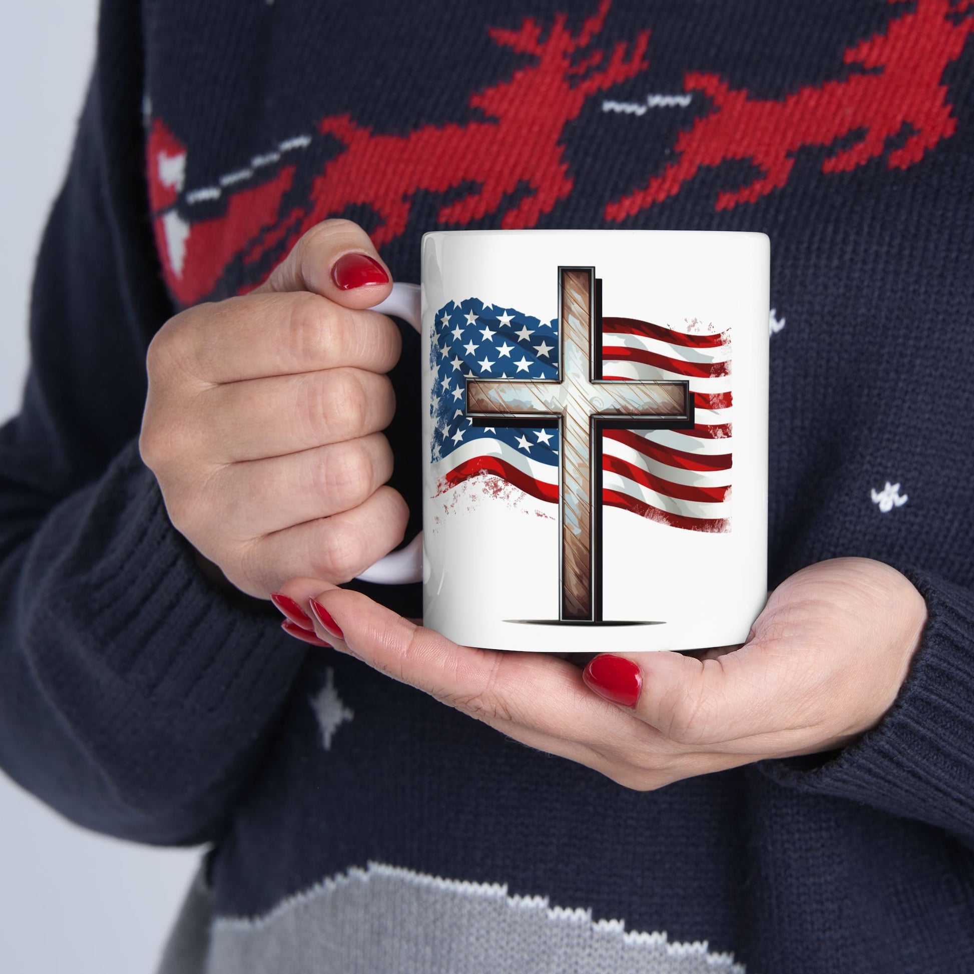 Details: Glossy ceramic mug printed with vibrant USA flag and cross design